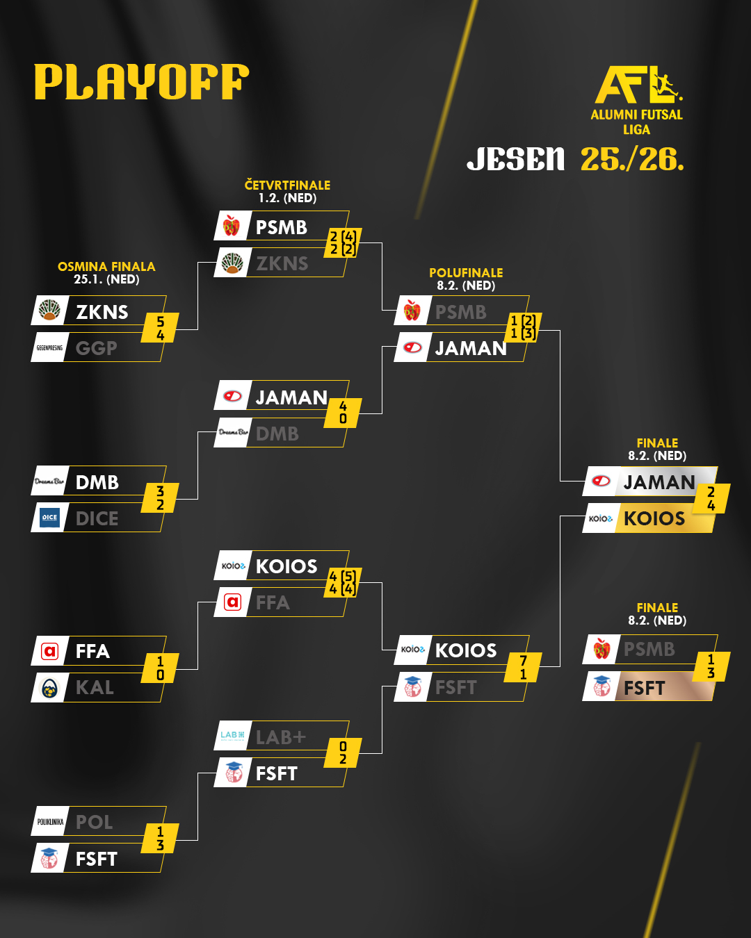 U nedjelju 8.2.2025. u dvorani Kineziološkog fakulteta, odigrana je završnica jesenske Alumni Futsal Lige. Završnica nam je donijela utakmice polufinala, kao i finale te utakmicu za treće mjesto.