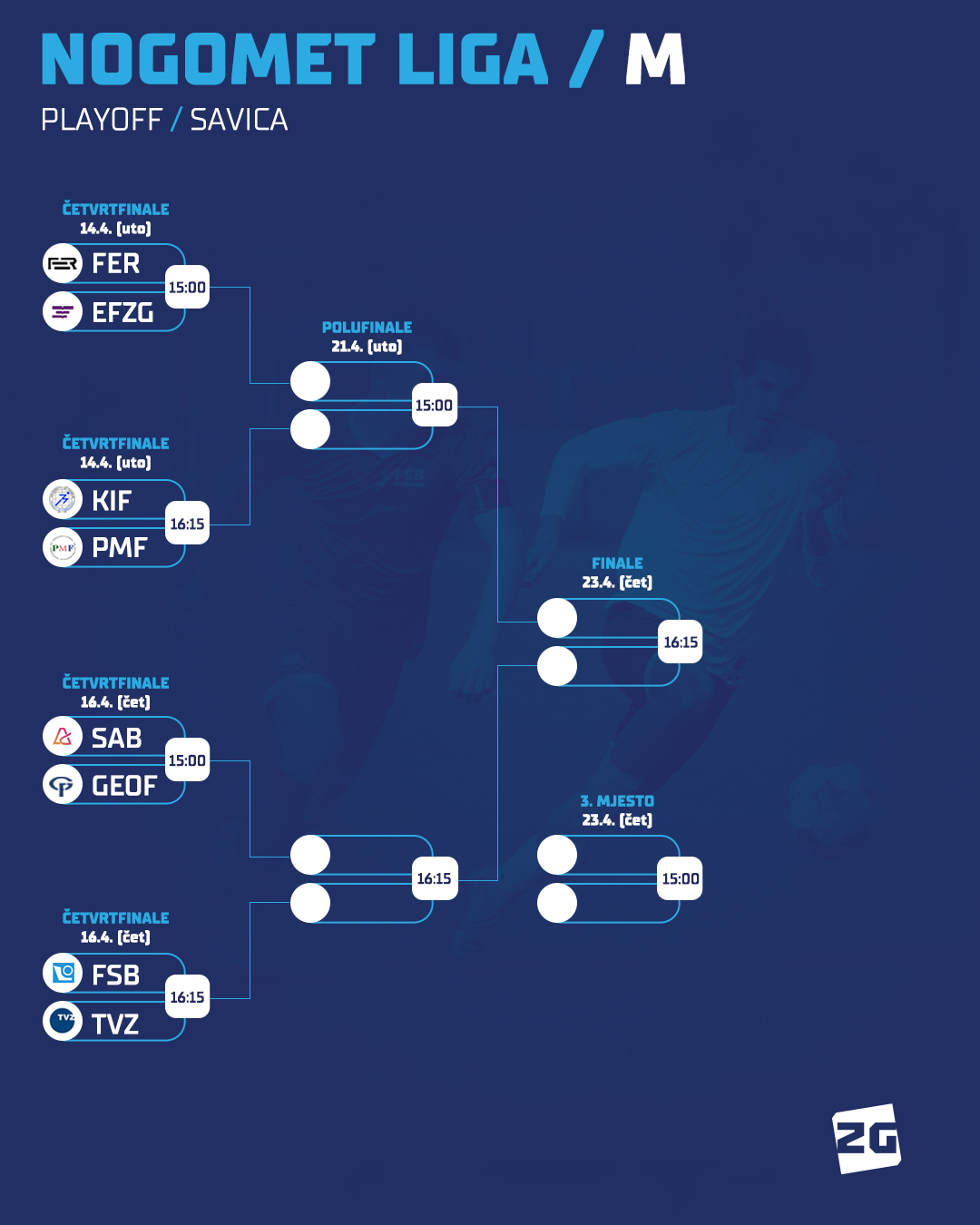 Uz plivanje utorak nam donosi i playoff fazu nogometnog natjecanja odnosno dvije utakmice četvrtfinala. Preostala dva susreta četvrtfinala slijede nam u četvrtak (16.4.) u istim terminima. Raspored i satnicu donosimo u nastavku: