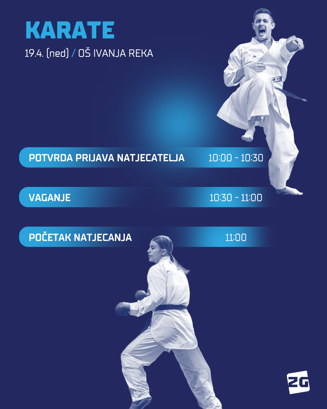 U nedjelju (19.4.) očekuje nas UniSport ZG natjecanje u karateu. Natjecanje će se održati u OŠ Ivanja Reka, a raspored i satnicu natjecanja donosimo u nastavku: