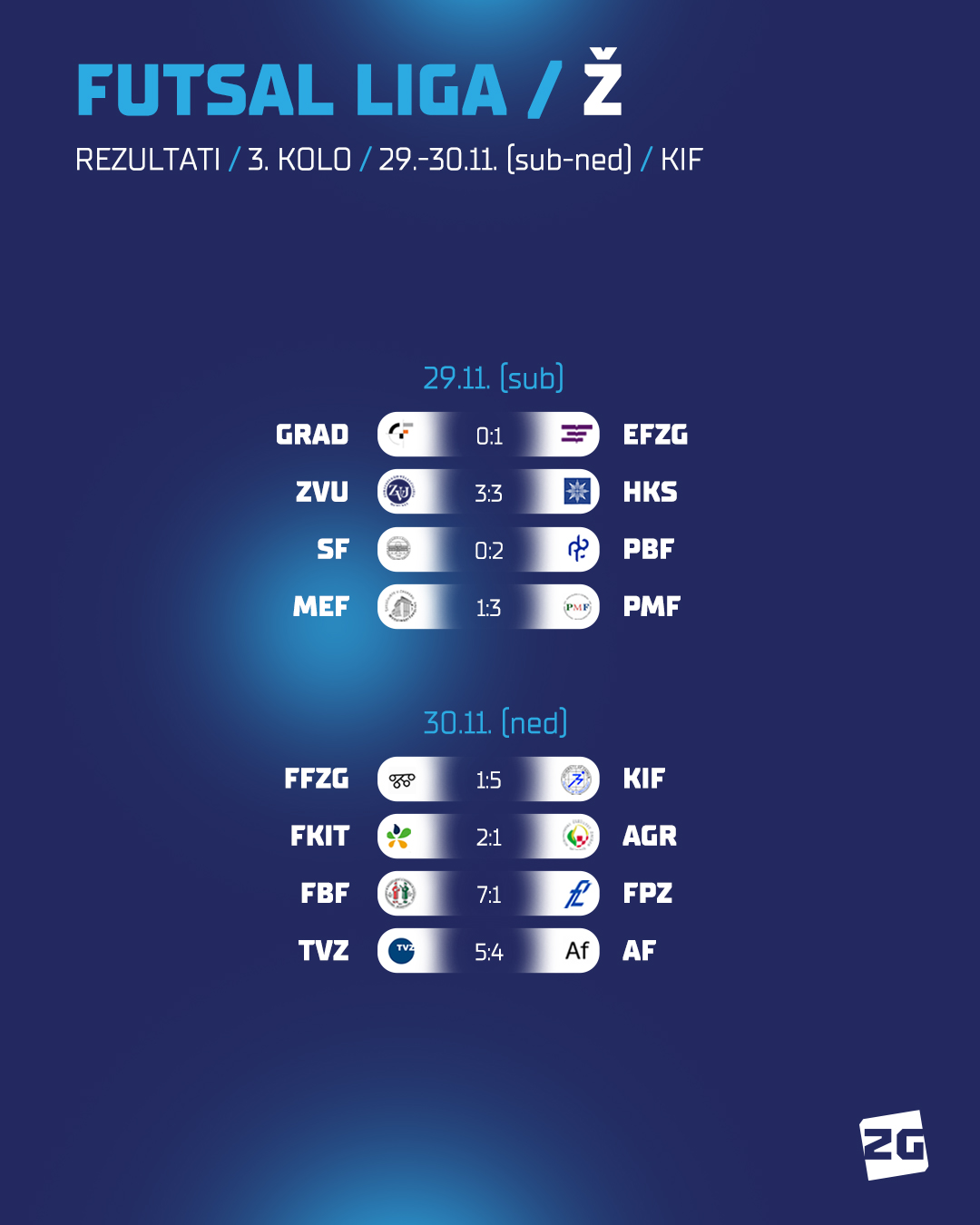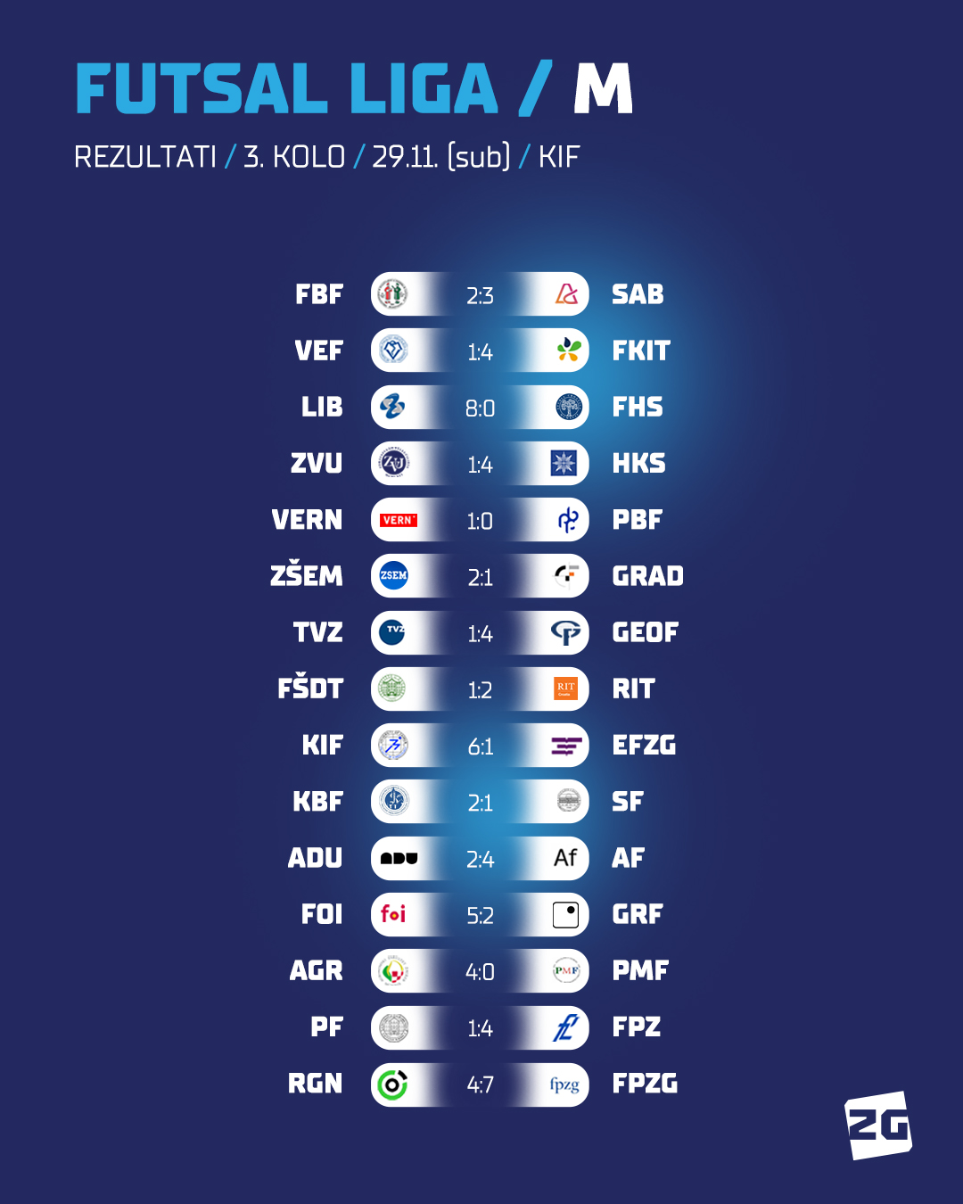 Sve utakmice muške futsal lige odigrane su u subotu (29.11.). Zanimljive susrete odigrale su ekipe ZŠEM i GRAD te KBF i SF koje su završile rezultatom 2:1 u korist ZŠEM-a i KBF-a, minimalnom razlikom VERN je uspio doći do bodova protiv ekipe PBF-a. Ostale je susrete krasio velik broj golova i stvorenih šansi. Ekipa Libertasa u pobjedi protiv ekipe FHS-a zabila je čak 8 golova.