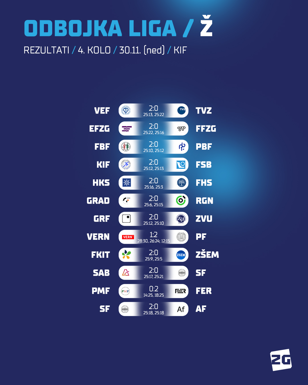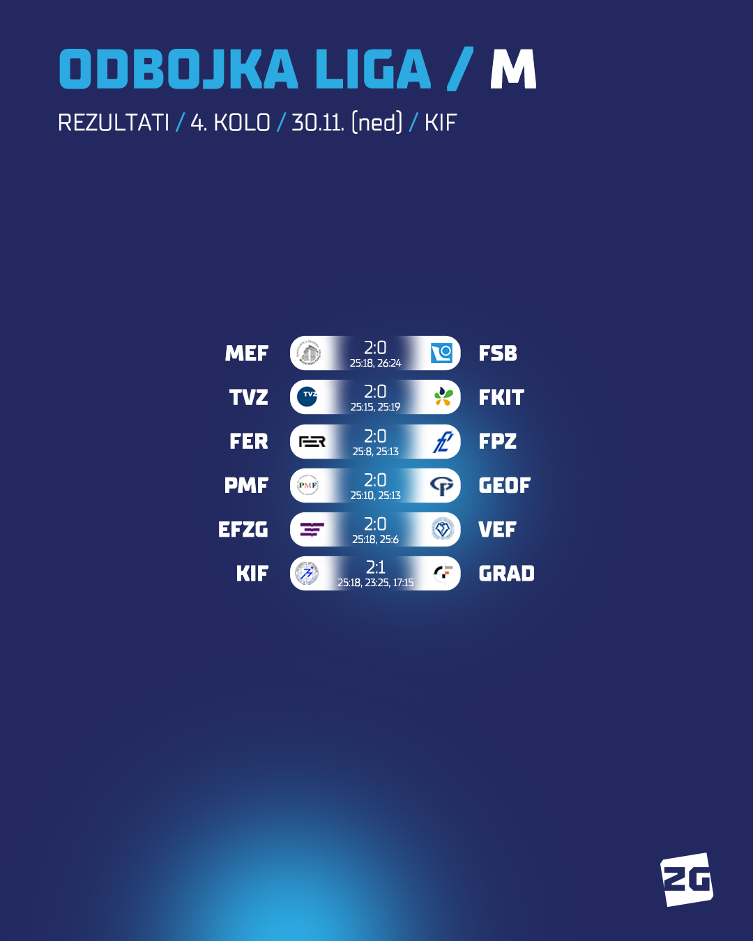 Odbojkaška liga kompletirala je 4. kolo u muškoj i ženskoj konkurenciji. Tek po jedna utakmica u muškoj i ženskoj konkurenciji završena je u 3. setu. U muškoj konkurenciji rezultatom 2:1 KIF je pobijedio ekipu GRAD i to rezultatom 17:15 (treći set). U ženskoj konkurenciji sličan scenarij odigrao se u utakmici VERN-a i PF-a. Ekipa PF-a u trećem setu rezultatom 15:12 osigurala je pobjedu.