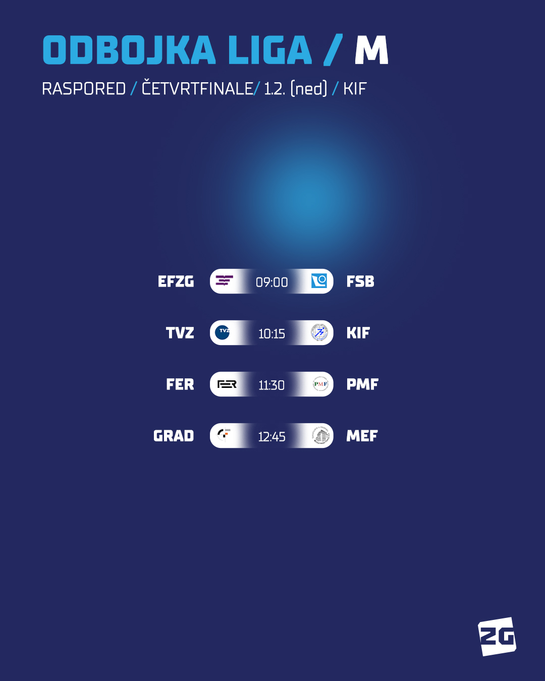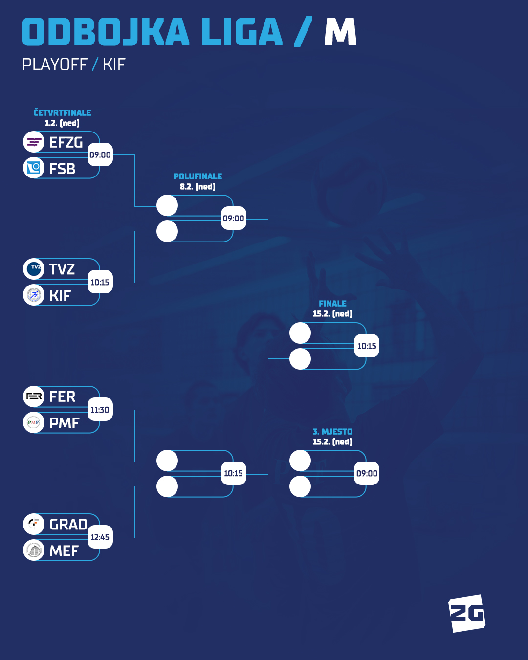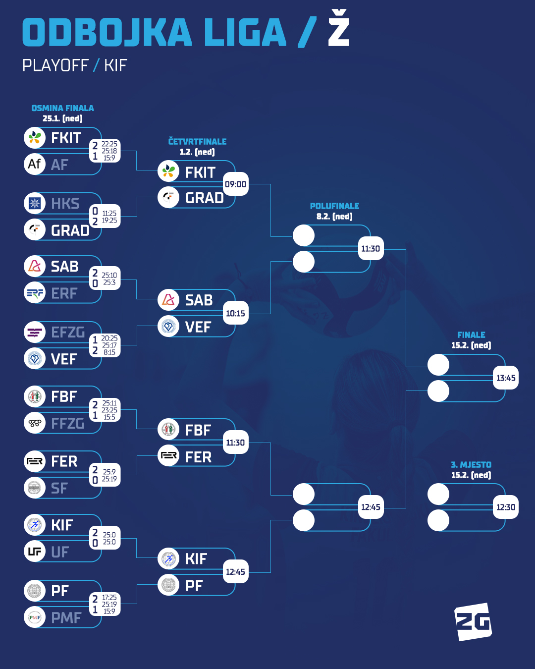 Odbojkaši i odbojkašice nastavit će natjecanje utakmicama četvrtine finala, a svi susreti (ukupno njih 8) održat će se u nedjelju (2.1.) u dvorani Kineziološkog fakulteta.