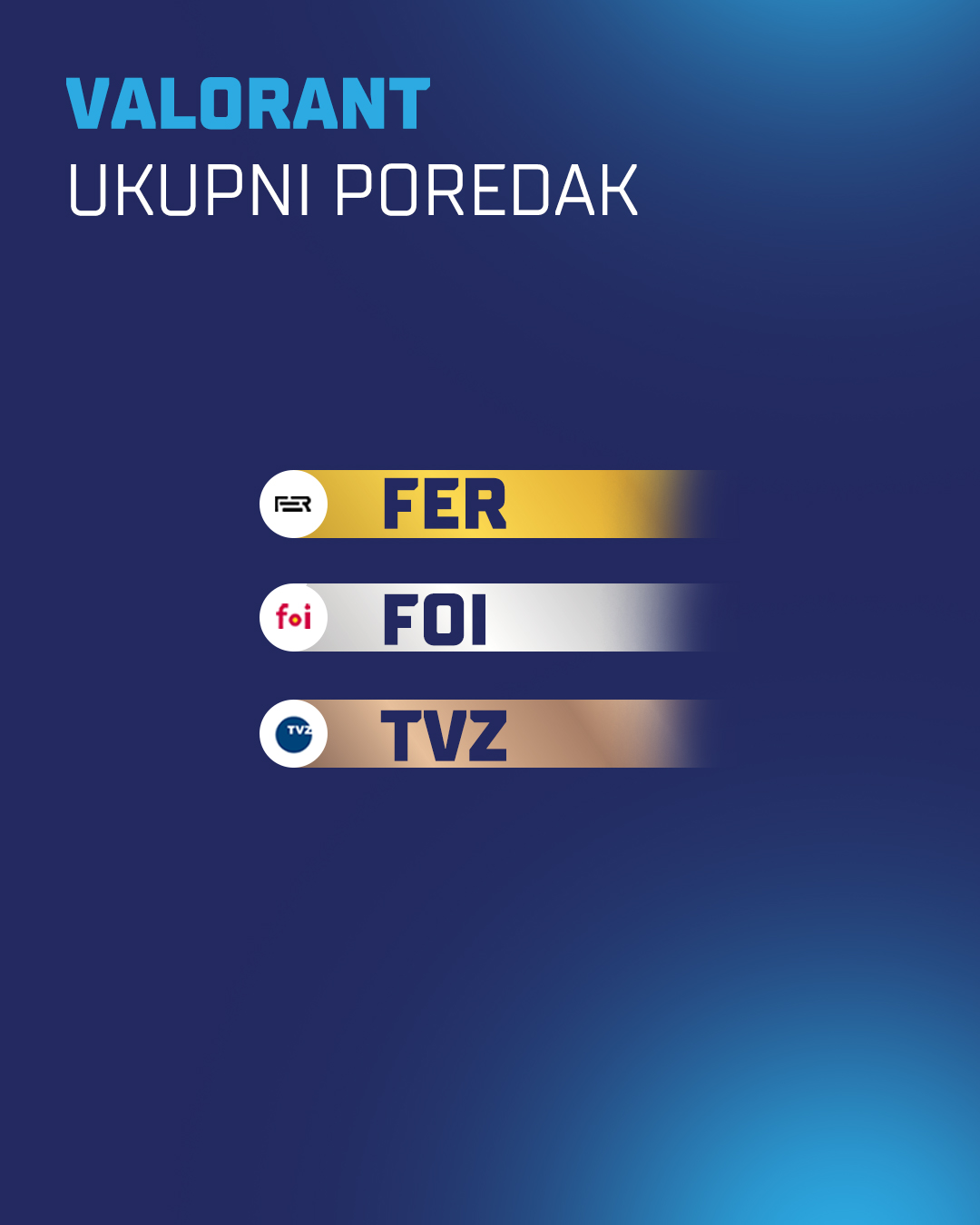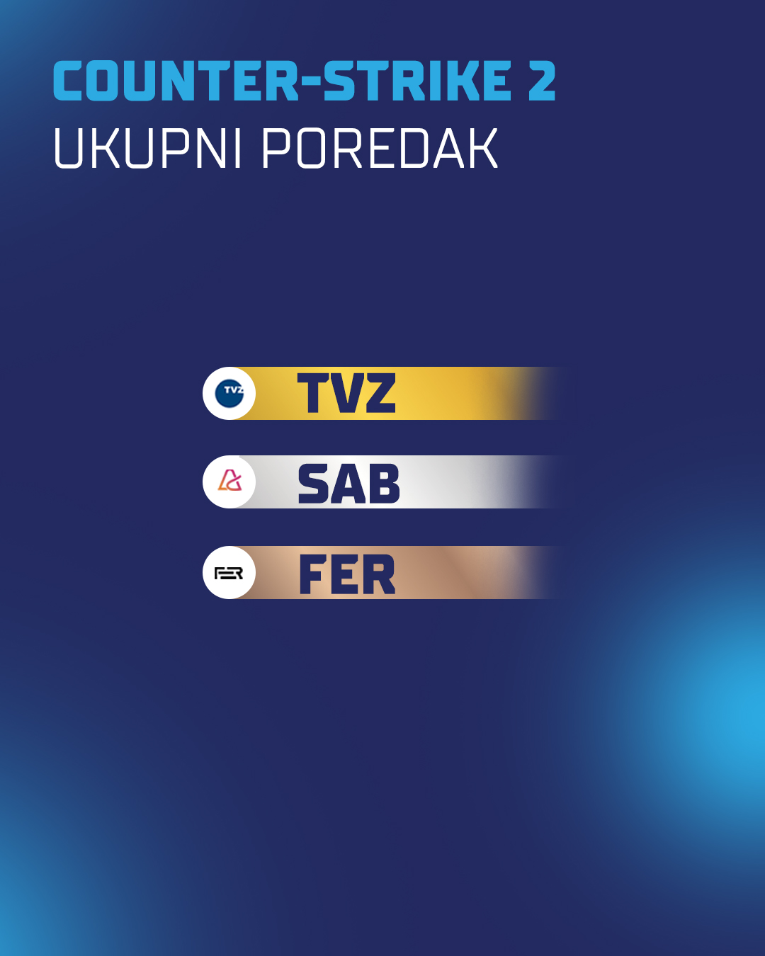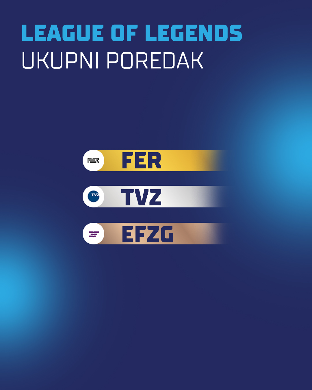 Zlatnom medaljom u sezoni 2025./2026. zasluženo su se okitili studenti Fakulteta elektrotehnike i računarstva koji su na prvo mjesto ukupnog poretka zasjeli u čak 3 igre (Valorant, League of Legends i Rocket League). Srebro su zaslužili studenti Tehničkog veleučilišta u Zagrebu, dok je brončanu medalju odnijelo Sveučilište Algebra Bernays.