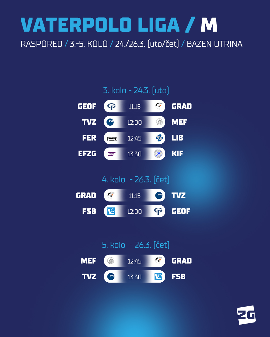 Utorak (24.3.) nam donosi 3. kolo vaterpolo lige, dok će se 4. i 5. odigrati u četvrtak (26.3.). Lokacija je bazeni Utrine, a raspored i satnicu susreta pogledaj u nastavku: