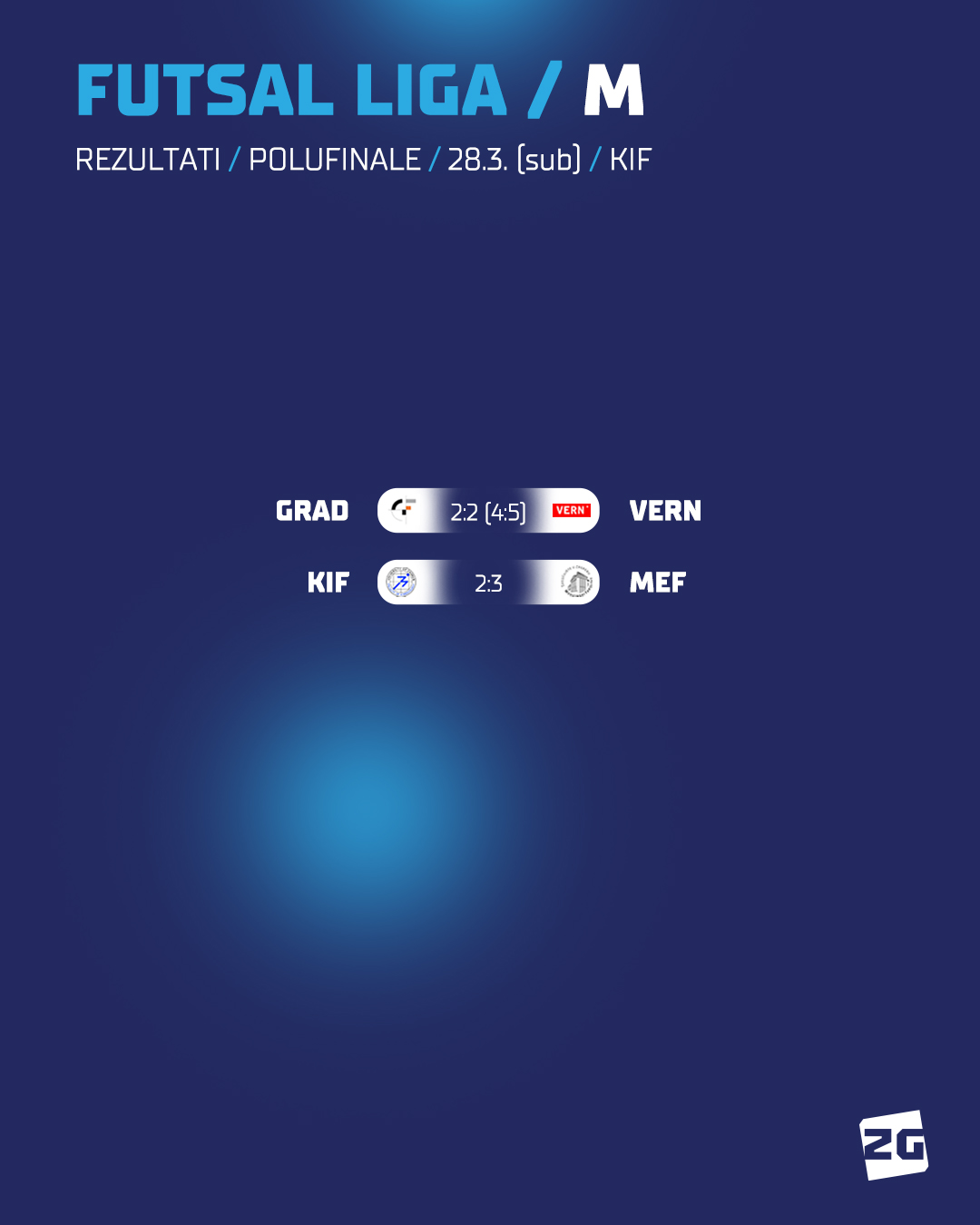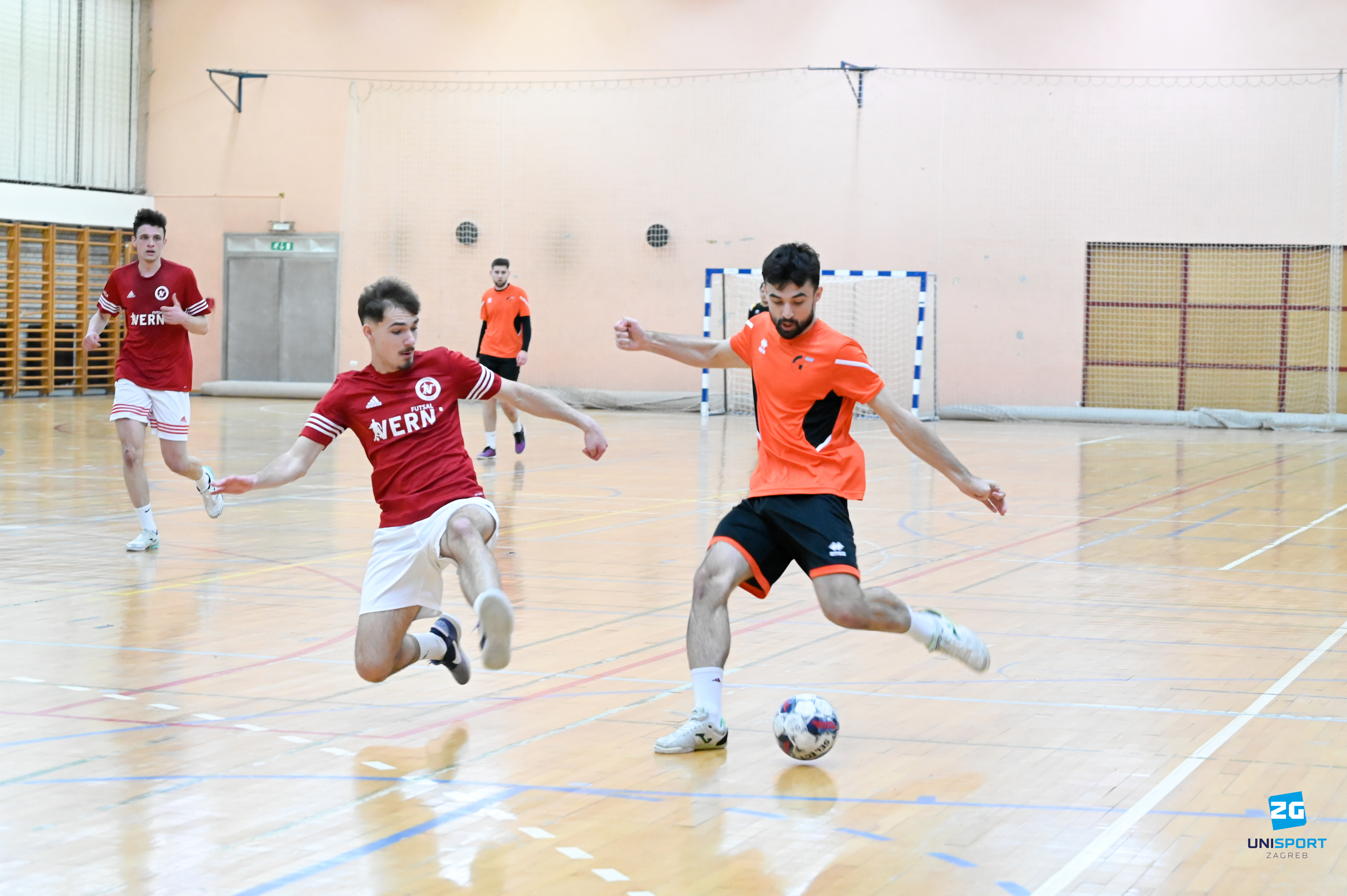 U prvom polufinalnom susretu između ekipa Građevinskog fakulteta i VERN-a, gledali smo dva različita poluvremena. U prvom poluvremenu dominirala je ekipa VERN-a koja je svoju dominaciju naplatila dvama pogodcima i vodila 2-0 na poluvremenu. No, utakmica se okreće u drugom poluvremenu kada Građevinski fakultet postiže dva pogotka i odvodi utakmicu u raspucavanje odnosno na penale. Precizniji s linije 6m bili su studenti VERN-a i time zaslužili ulaznicu za finale, dok će ekipa Građevinskog fakulteta dobiti priliku uzeti brončanu medalju.